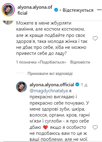 Alyona Alyona не змовчала у відповідь та підкреслила, що у неї все гаразд зі здоров'ям. Зірка жорстко відповіла на негативний коментар.