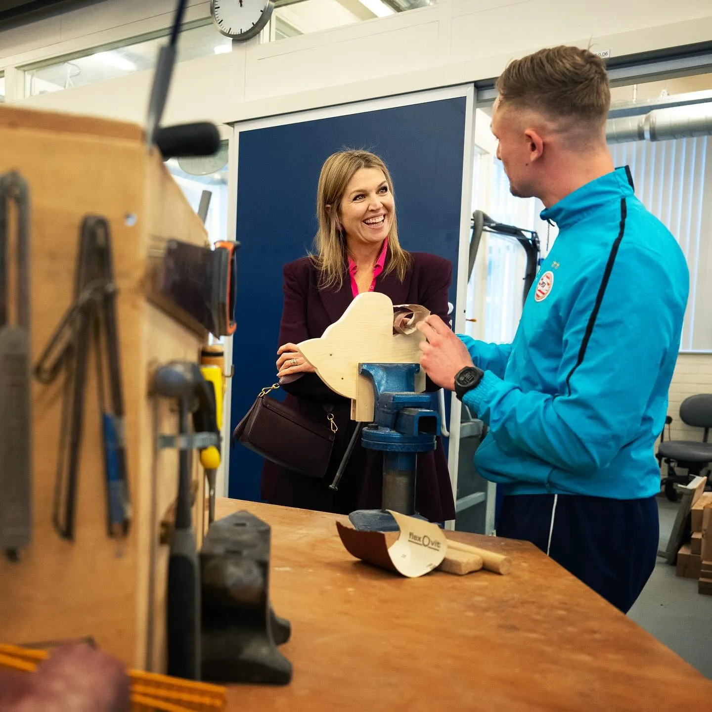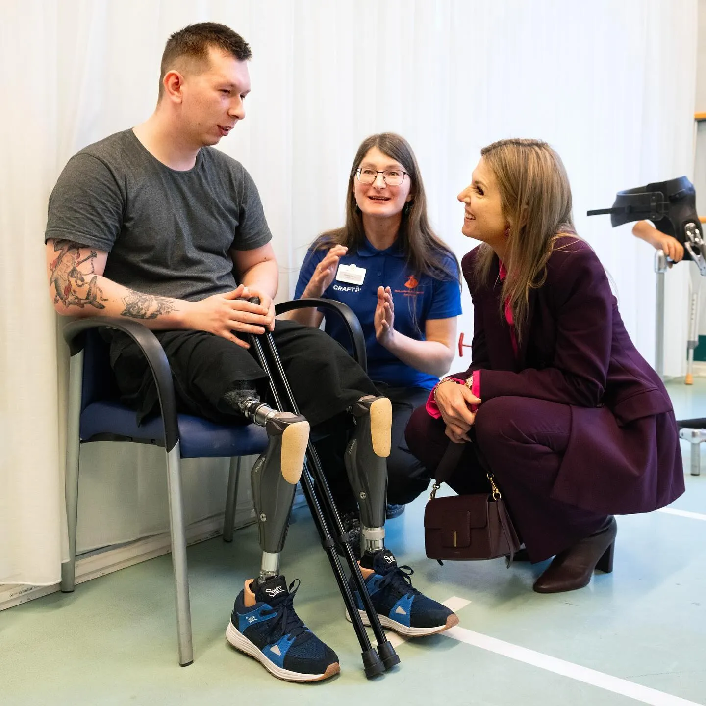 Королева Максима завітала у реабілітаційний центр і поспілкувалась з захисниками про їхній досвід і шлях до одужання. Поранені бійці виконують вправи на ходьбу, рух, працюють з деревом і металом.