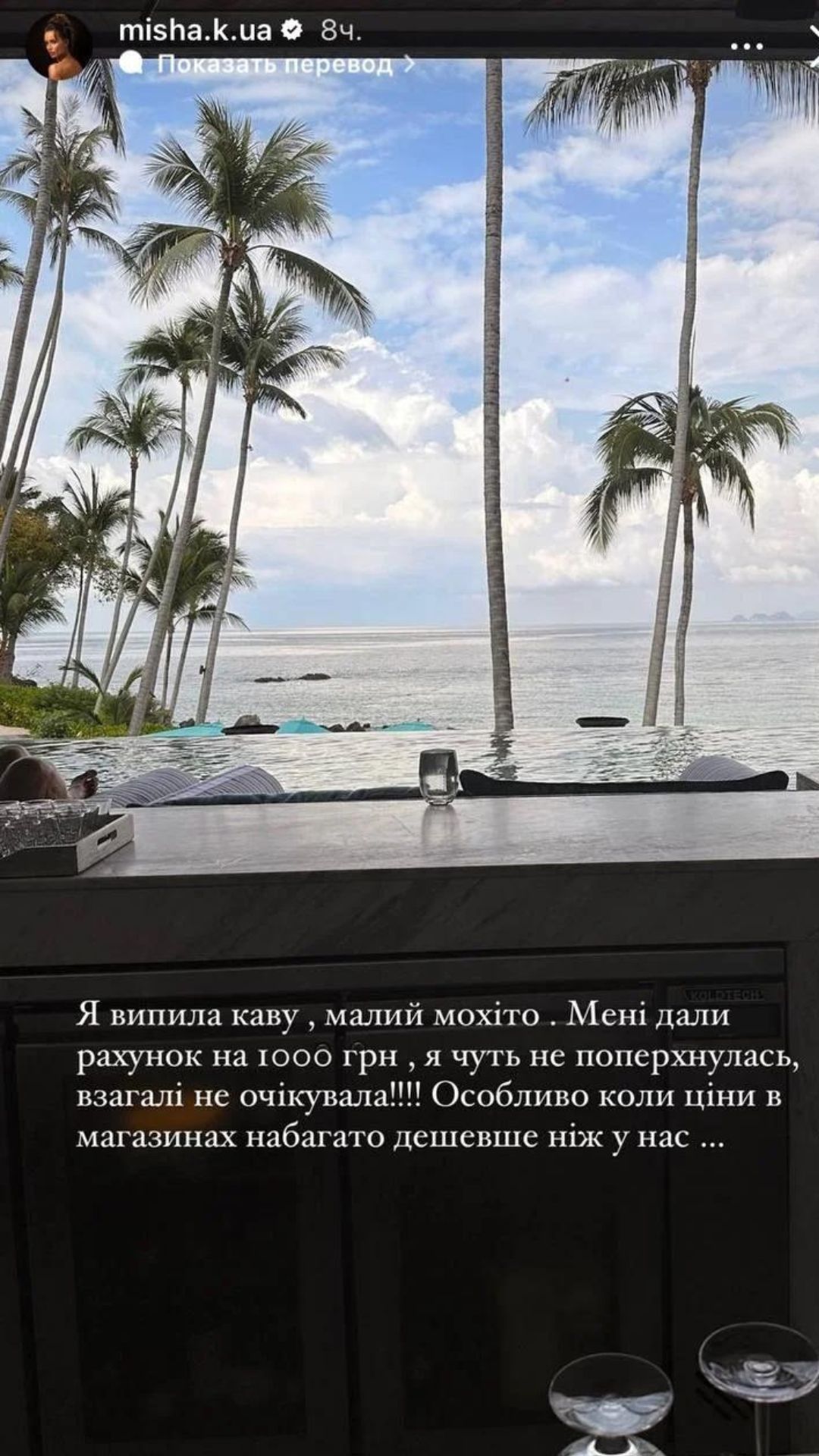 Лише за мохіто та каву акторка заплатила тисячу гривень. Крім того, їй довелося віддати вісім з половиною тисяч за вхід на цей пляж.