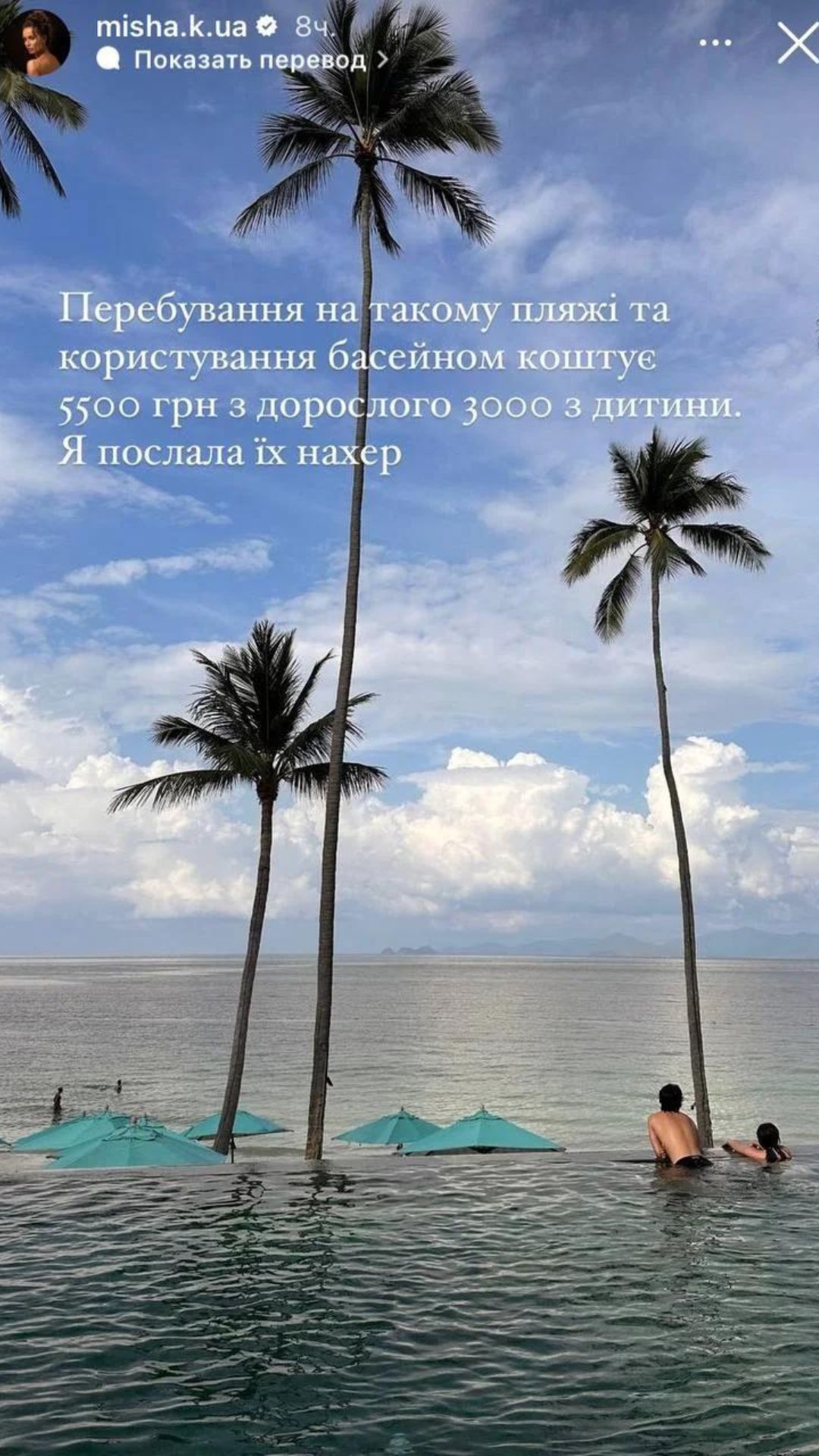 Знаменитість розповіла, що вартість за відпочинок на приватному пляжі, де гарний пляж та чиста вода, надвисока. Так, щоб насолодитися комфортним відпочинком, дорослим доведеться заплатити 5,5 тисячі гривень, а дітям – три тисячі гривень.