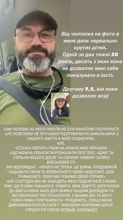 Телеведуча Маша Єфросиніна не так часто показує своїх рідних у соціальних мережах: старша донька забороняє публікувати з нею фото, а чоловік ніколи не був фанатом публічності. Та днями вона показала нове фото Тимура Хромаєва, який служить у ЗСУ.