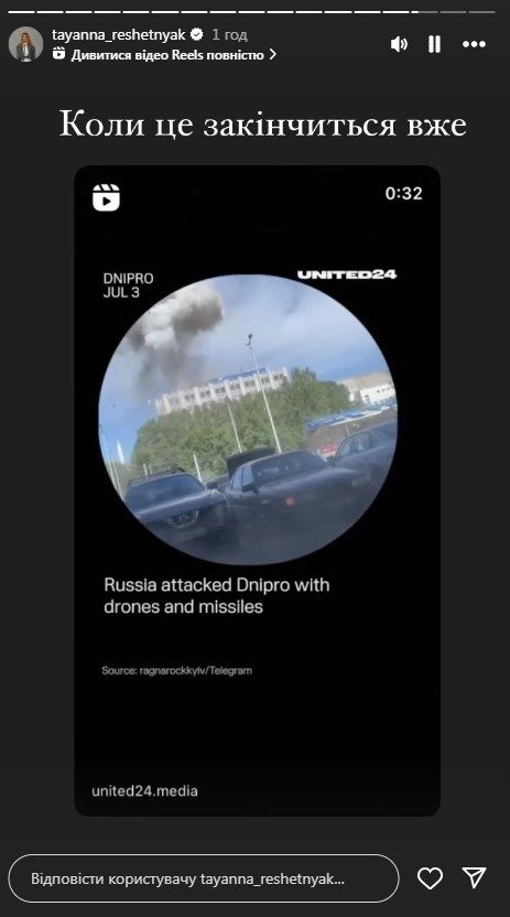 Григорій Решетник відреагував на обстріл Дніпра / Скриншоти з інстаграм-сторіс