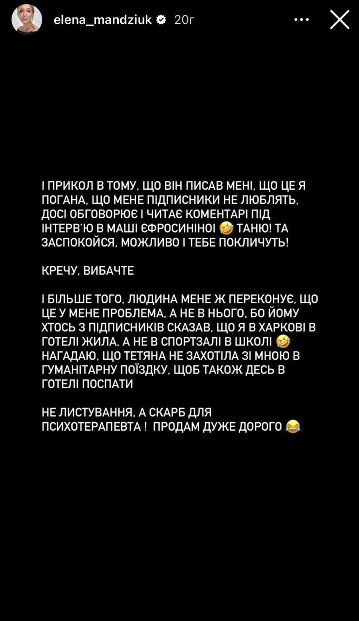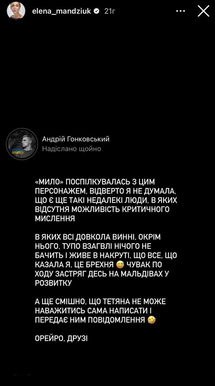 В ответ Андрей заявил, что Елене их жизнь интереснее, чем своя, и сообщил, что подаст в суд за публичную клевету. Кроме того, Гонковский назвал Мандзюк лгуньей. Блогер отметил, что Елена нередко и сама обманывает фолловеров насчет своего волонтерства. Он привел доказательства, что якобы во время гуманитарной поездки в Харьков Мандзюк жила не в спортзале школы, а в гостинице. Кстати, это эта поездка, куда Елена предлагала поехать и Татьяне Пренткович, девушке Гонковского.