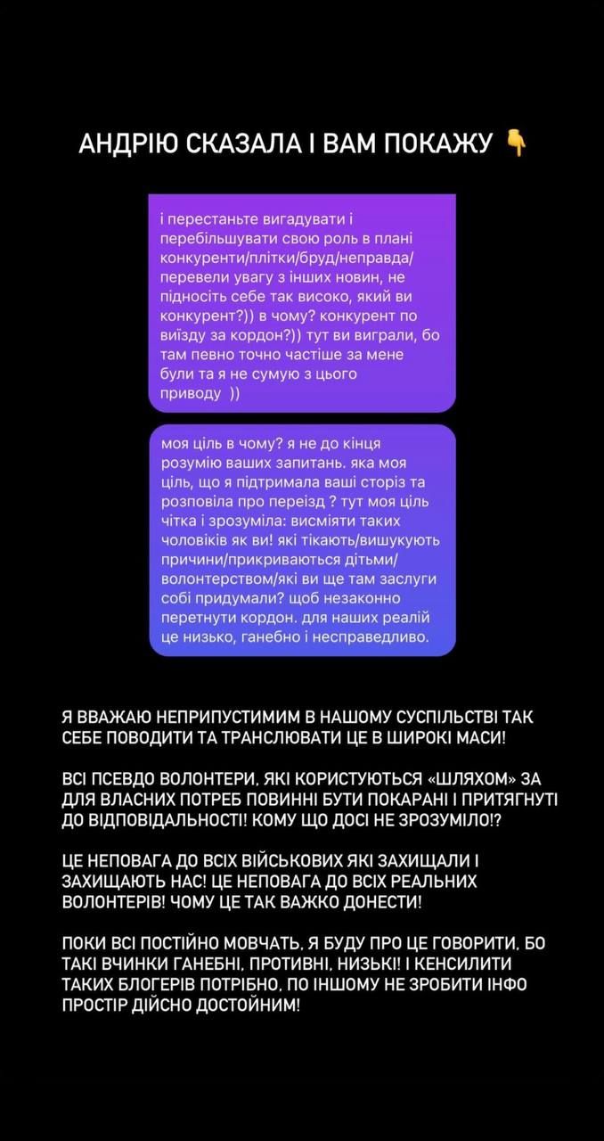 Чувак по ходу застрял где-то на Мальдивах в развитии. Не возвышайте себя так высоко, какой вы конкурент мне. Конкурент по выезду за границу? Здесь вы выиграли, потому что там, вероятно, точно чаще были за меня, но я не печалюсь об этом. Моя цель – высмеять таких мужчин, как вы, которые убегают, выискивают причины, прикрываются детьми, волонтерством, чтобы незаконно пересечь границу. Для наших реалий это – низко, позорно, несправедливо,