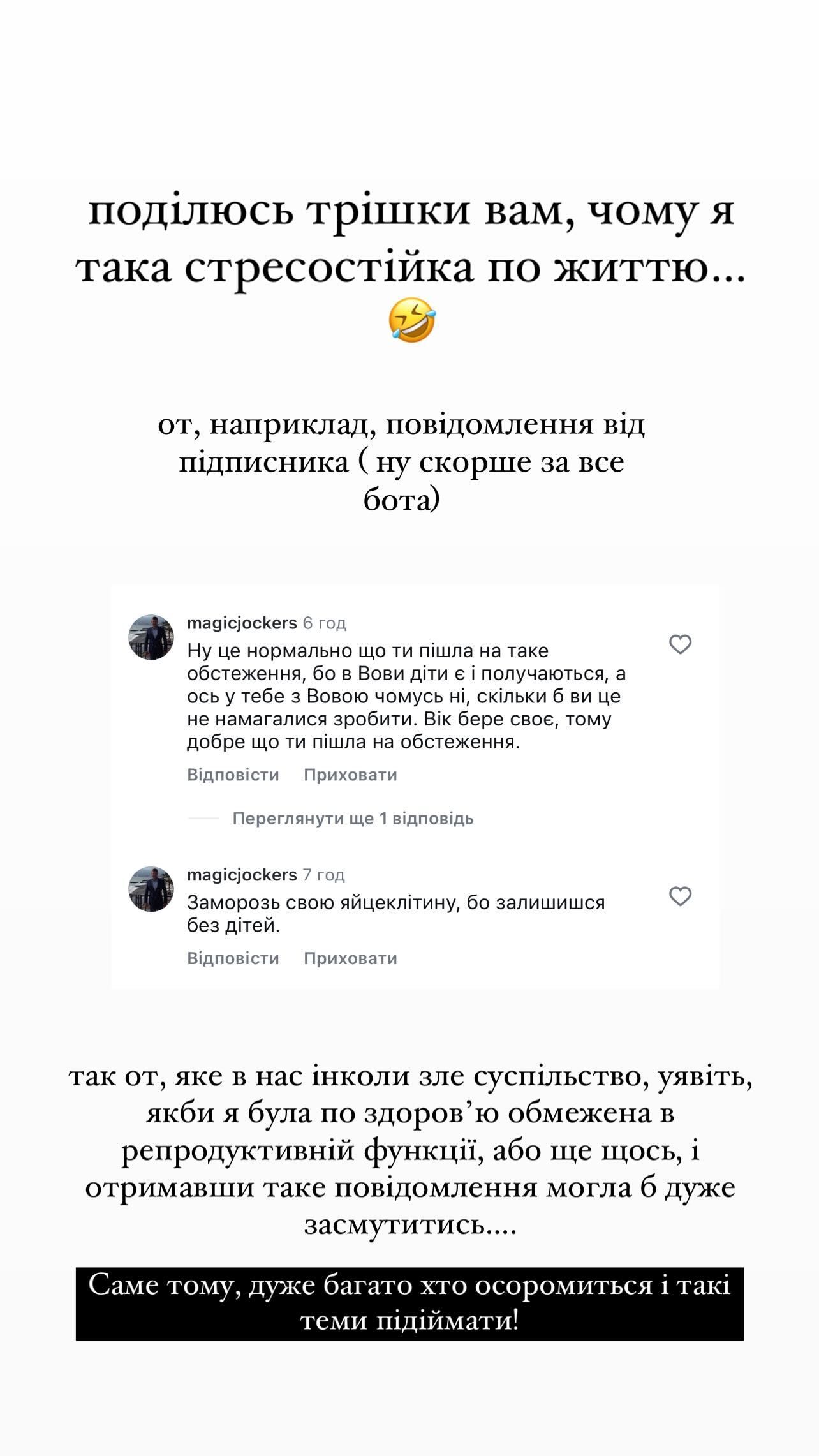 Кристина Горняк на днях пошла в специализированную клинику, где обследовалась и получила результаты анализов по своей репродуктивной системе. В комментариях под одним из сообщений блогер получила комментарий с упреком о том, что она бесплодна и до сих пор не родила детей из-за возраста.