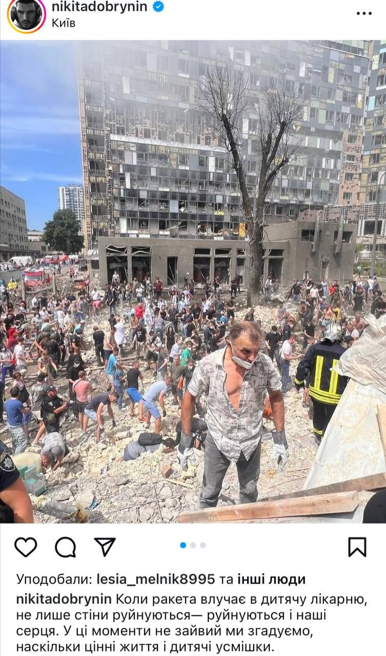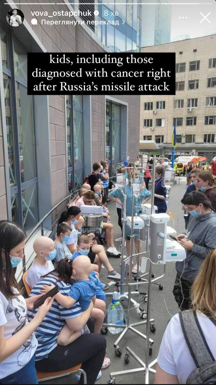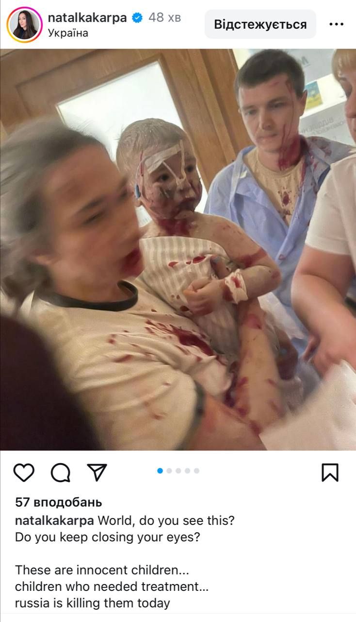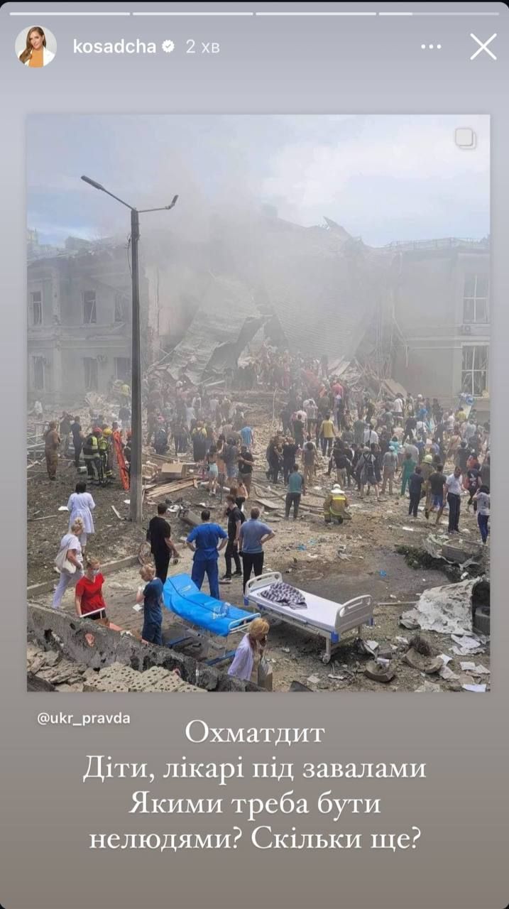 Фото последствий циничной атаки российских оккупантов должен увидеть весь мир. Именно об этом говорят сегодня, 8 июля, украинские публичные лица, певцы и актеры, пишет Show 24. Знаменитости распространяют кадры из "Охматдета" и обращаются к своим иностранным подписчикам.