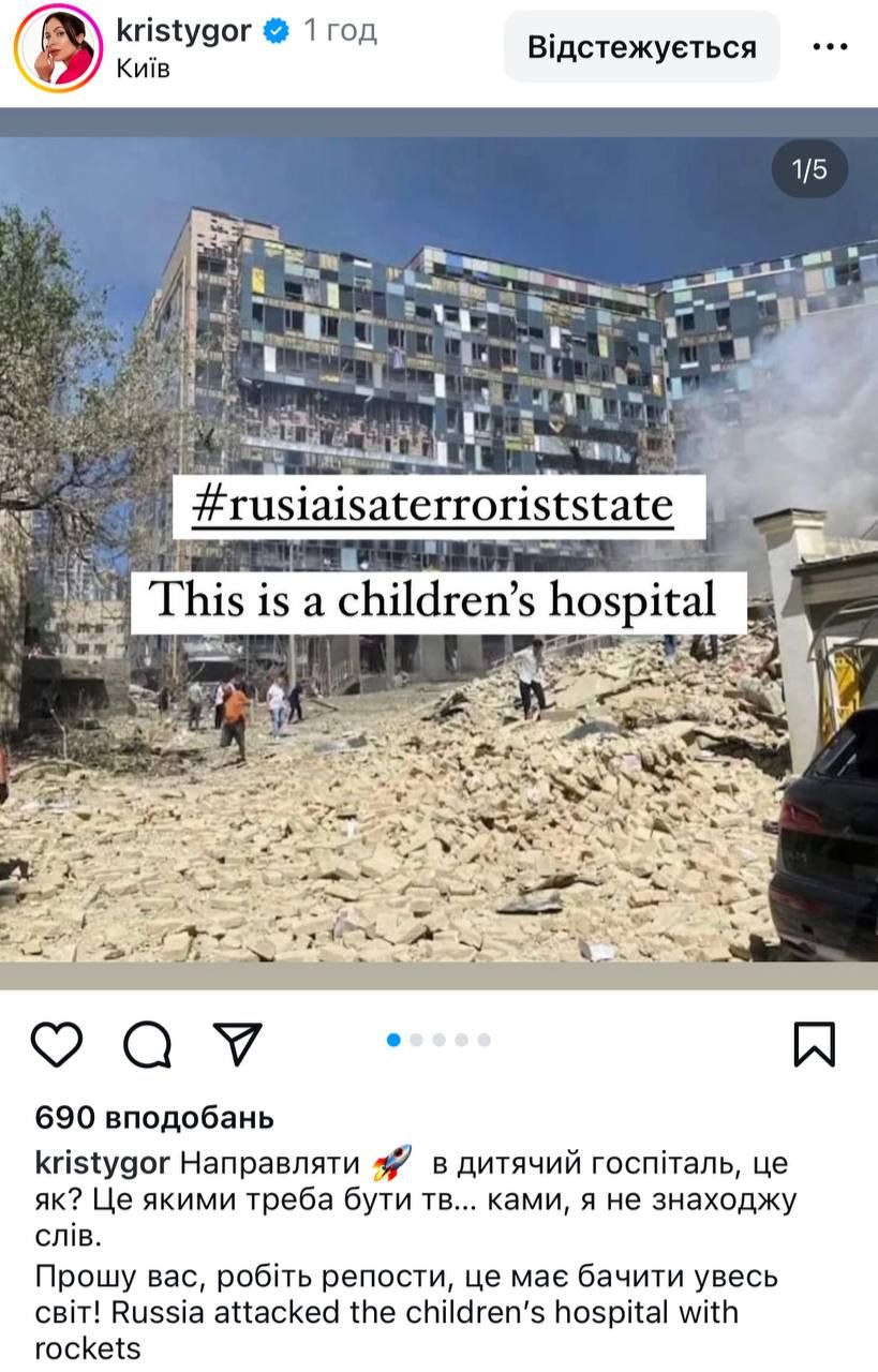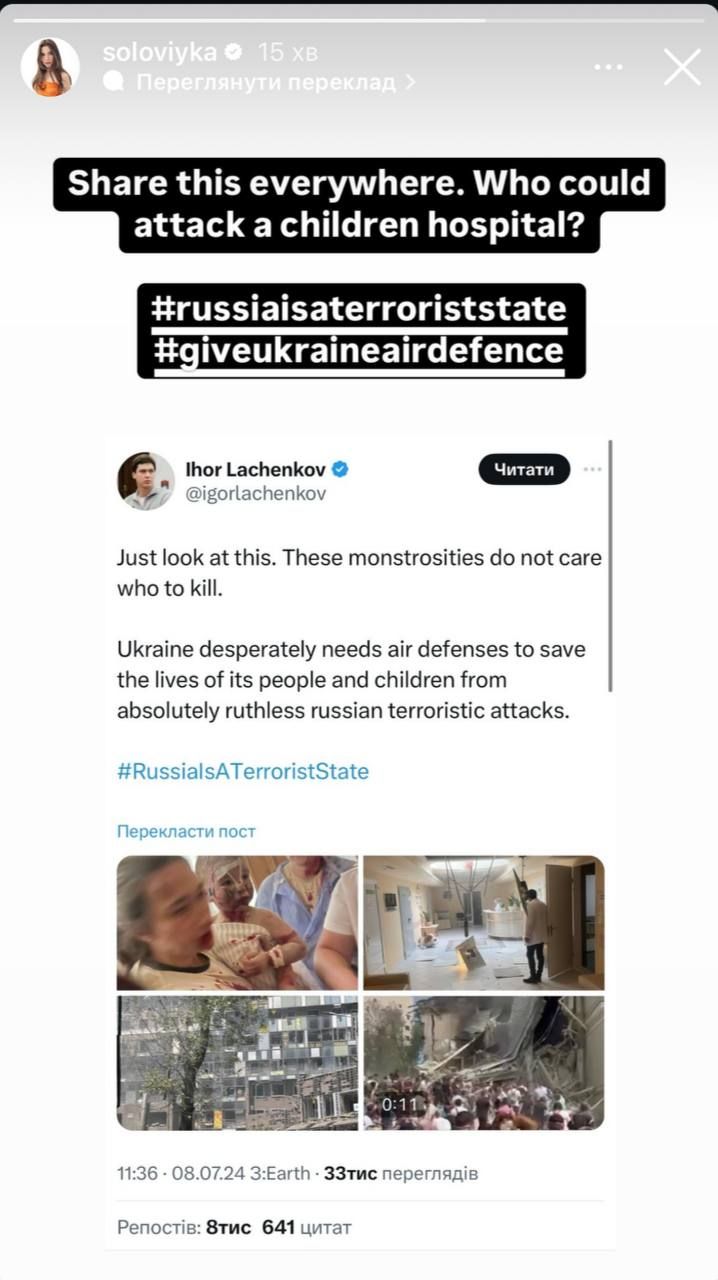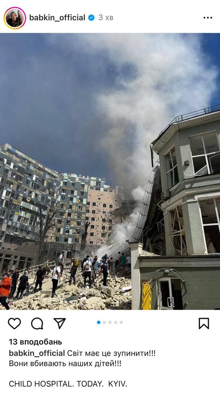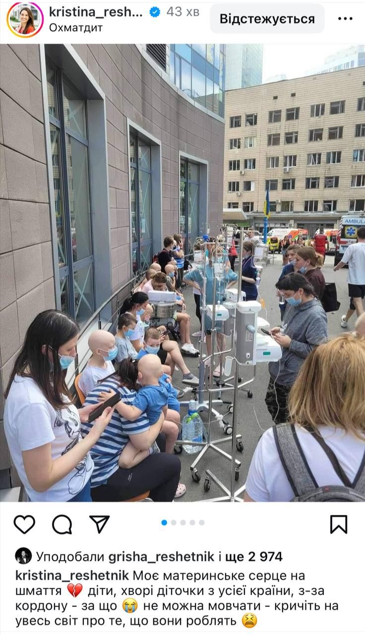 Певица напомнила, что всего несколько недель назад лежала в "Охматдете" со старшим сыном. Уже утром 8 июля больница оказалась под российским ударом.