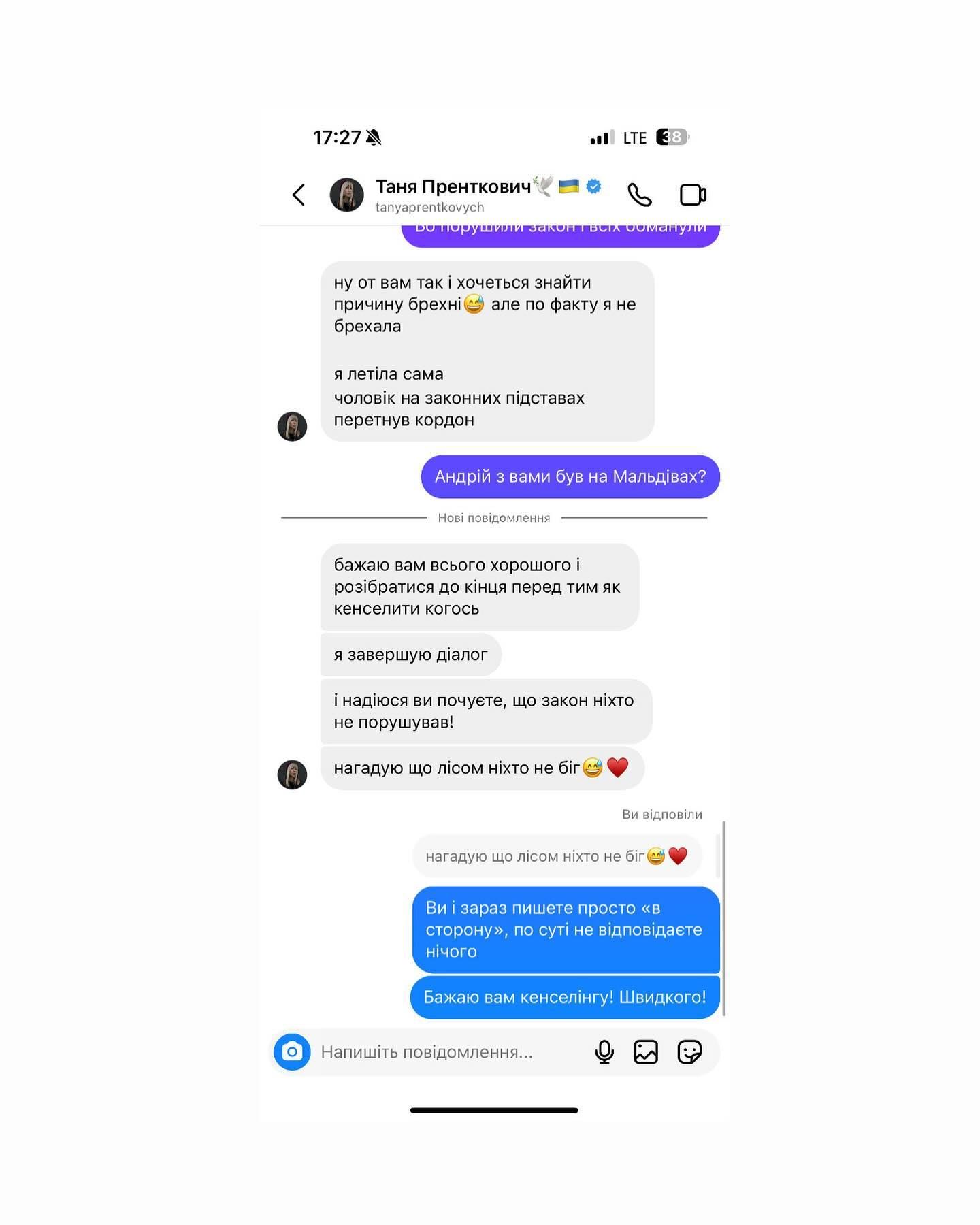 Пользователь Валерия выложила в сеть переписку с Таней Пренткович по поводу выезда ее мужа за границу. Блогерша отвечала на возмущение подписчицы.