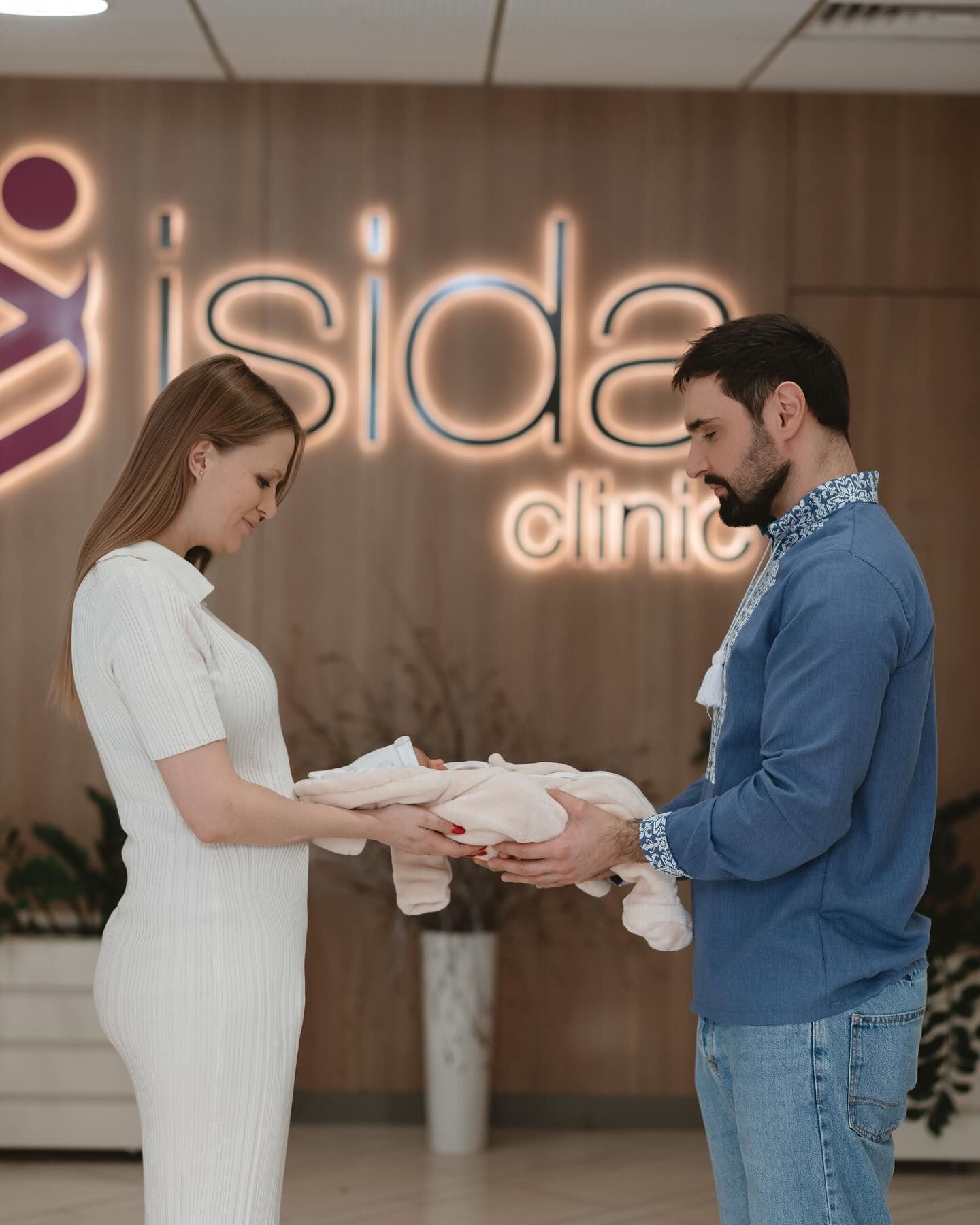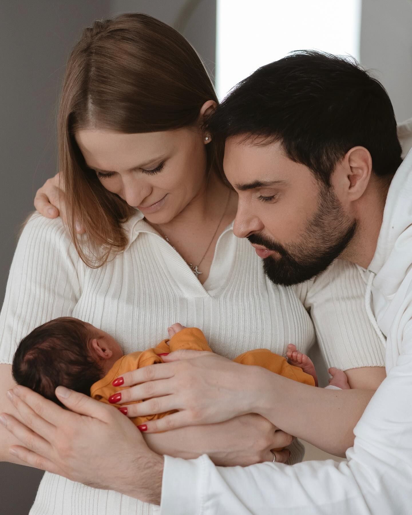 На нових світлинах Віталій Козловський та Юлія Бакуменко позували після виписки з пологового будинку. Співак позував перед камерою у вишитій сорочці та білому світшоті. Його дружина постала у білосніжній сукні довжини міді.