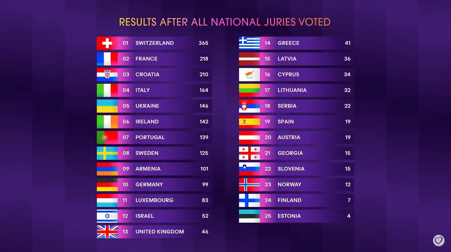 Найвище Україну оцінило професійне журі таких країн, як Чехія та Молдова. Жодного балу за Україну не віддали Сан Марино, Об'єднане Королівство, Мальта, Албанія, Іспанія, Вірменія, Словенія, Італія.