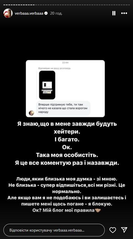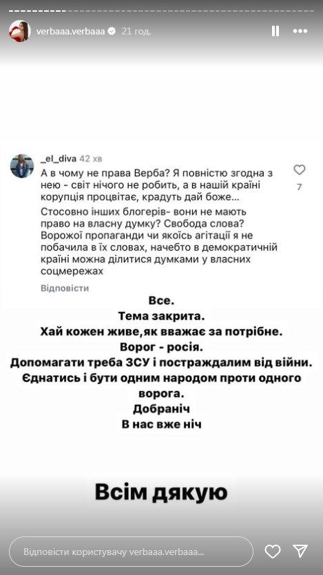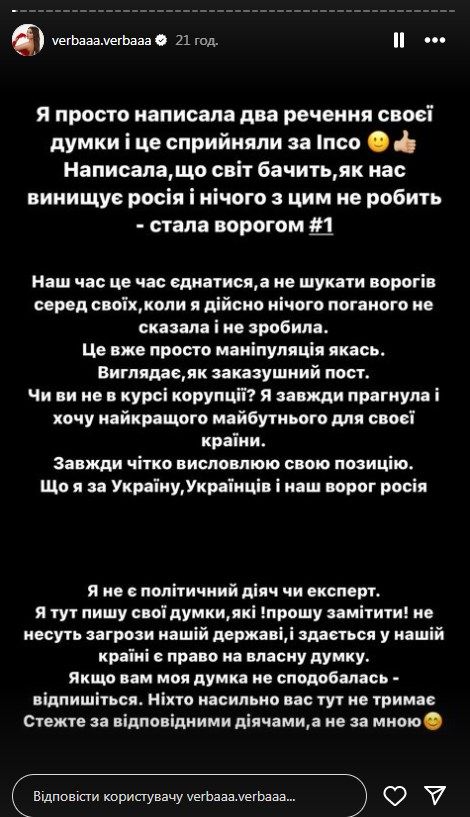 Я написала два речення своєї думки, і це сприйняли за ІПСО... Наш час – це час єднатися, а не шукати ворогів серед своїх, коли я дійсно нічого поганого не сказала і не зробила. Це вже просто маніпуляція якась… Я тут пишу свої думки, які, прошу зауважити, не несуть загрози нашій державі й, здається, у нашій країні є право на власну думку. Якщо вам моя думка не сподобалася – відпишіться. Ніхто насильно вас тут не тримає. Стежте за відповідними діячами, а не за мною,
