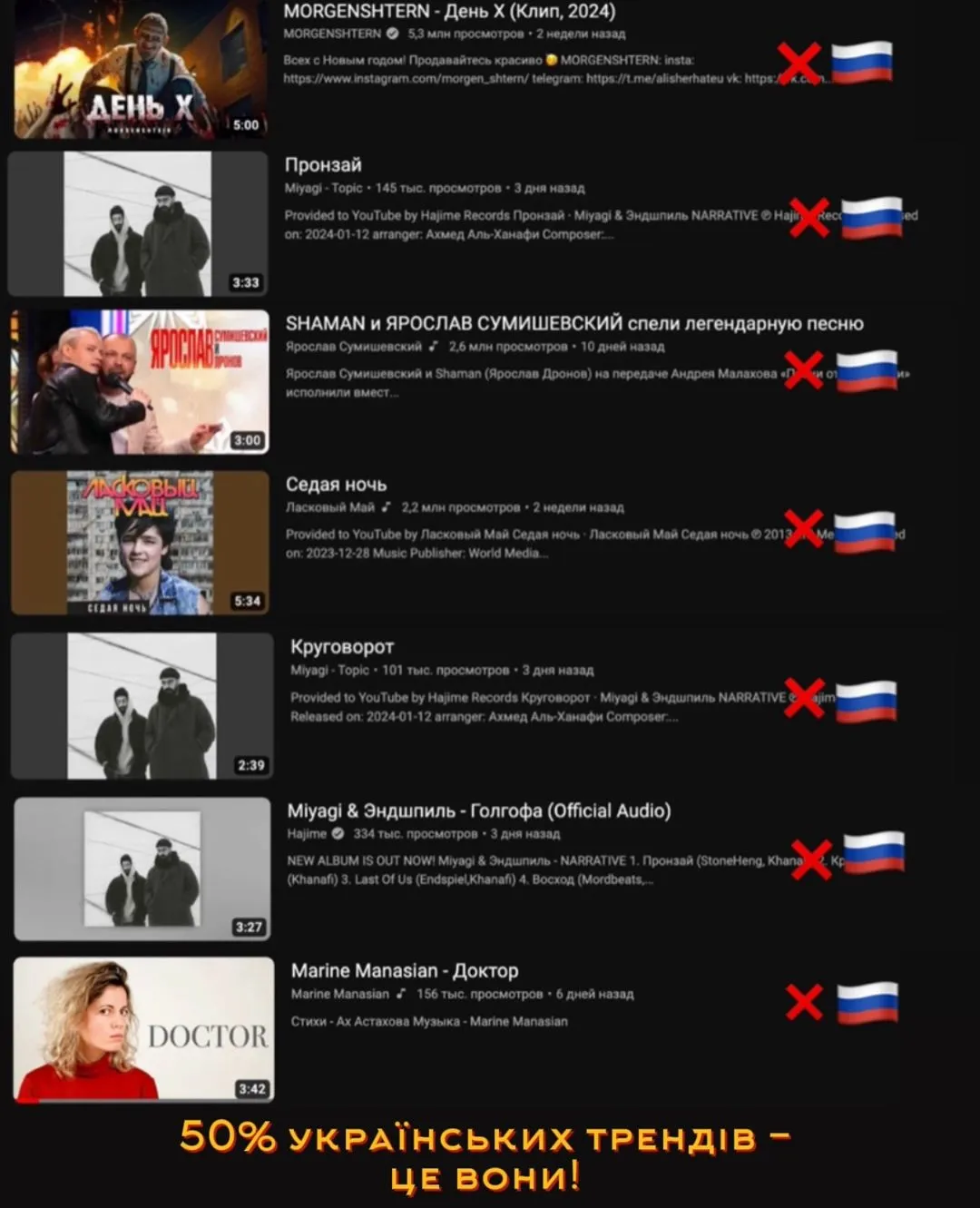 Це не вкладається в голові! Половина українських музичних трендів на YouTube – це російський контент. Це коли кожен день Україна утопає у крові та втрачає найкращих людей,